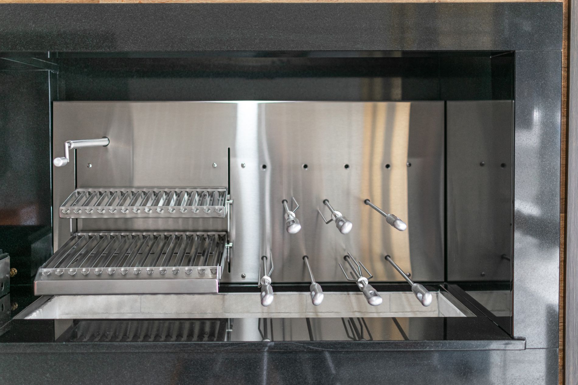 Todos os componentes críticos como os parafusos, os eixos onde encaixam os espetos, as grelhas, enfim, tudo que entra em contato com o fogo, sal e gordura são feitos propositalmente desse material para garantir durabilidade.